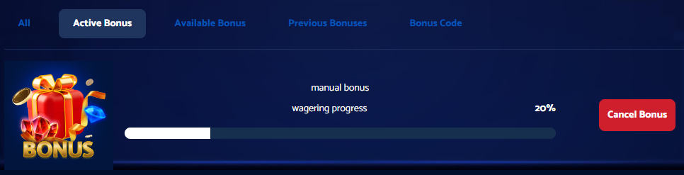 To check how much wagering you have left on a bonus, simply head over to the bonus page, and go to the 'Active Bonus' section, after that, you'll be able to see how far along the wagering requirement you are, as shown below: